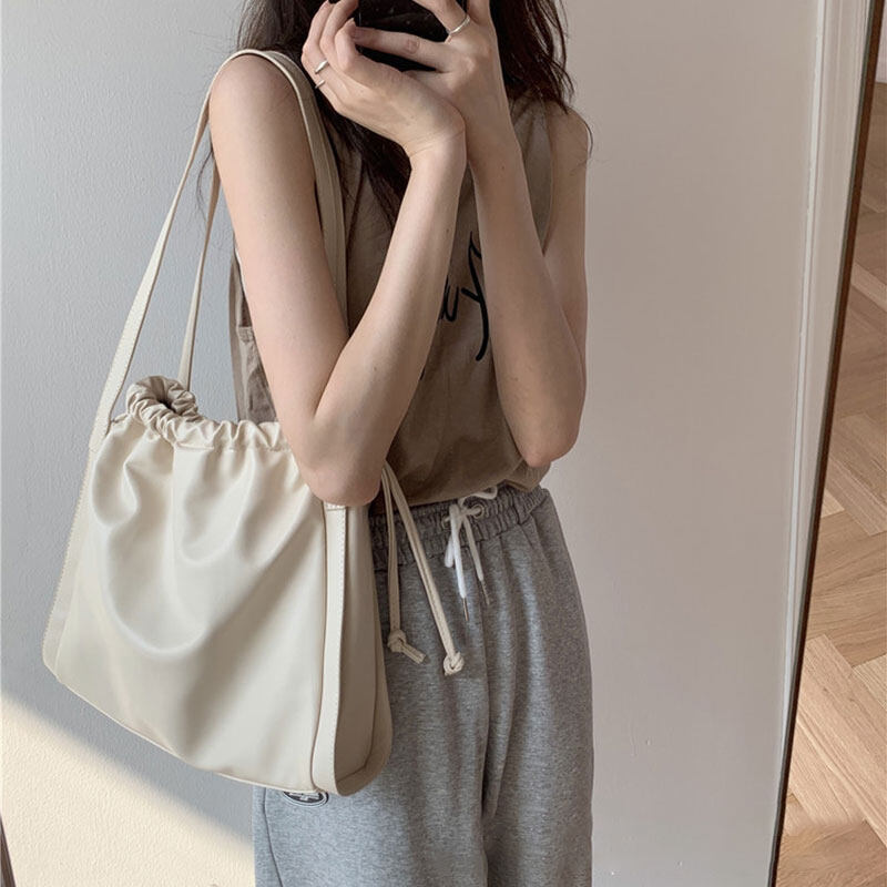 NALLCHEER Women's shoulder bag fashion casual bucket bag pu leather drawstring tote bag large capacity